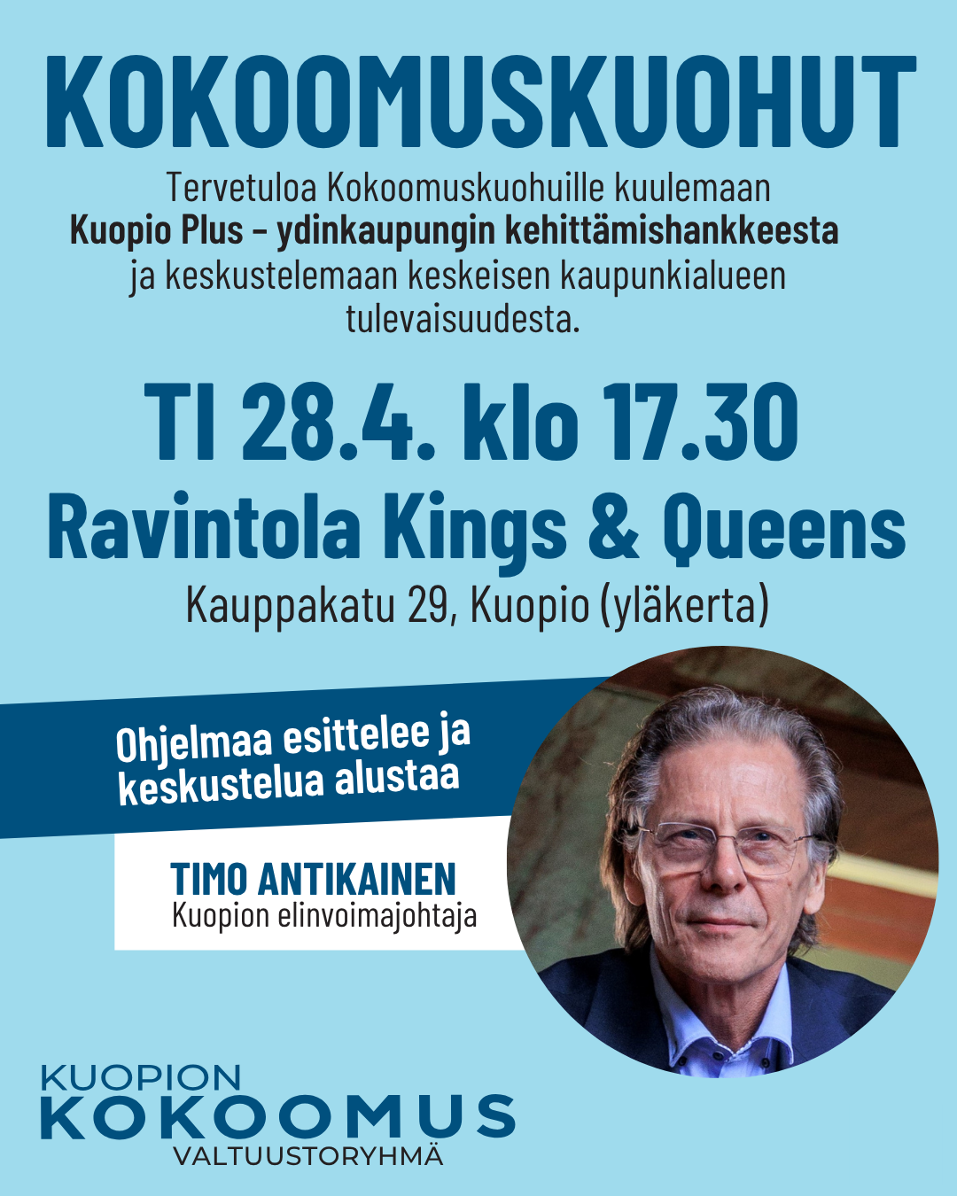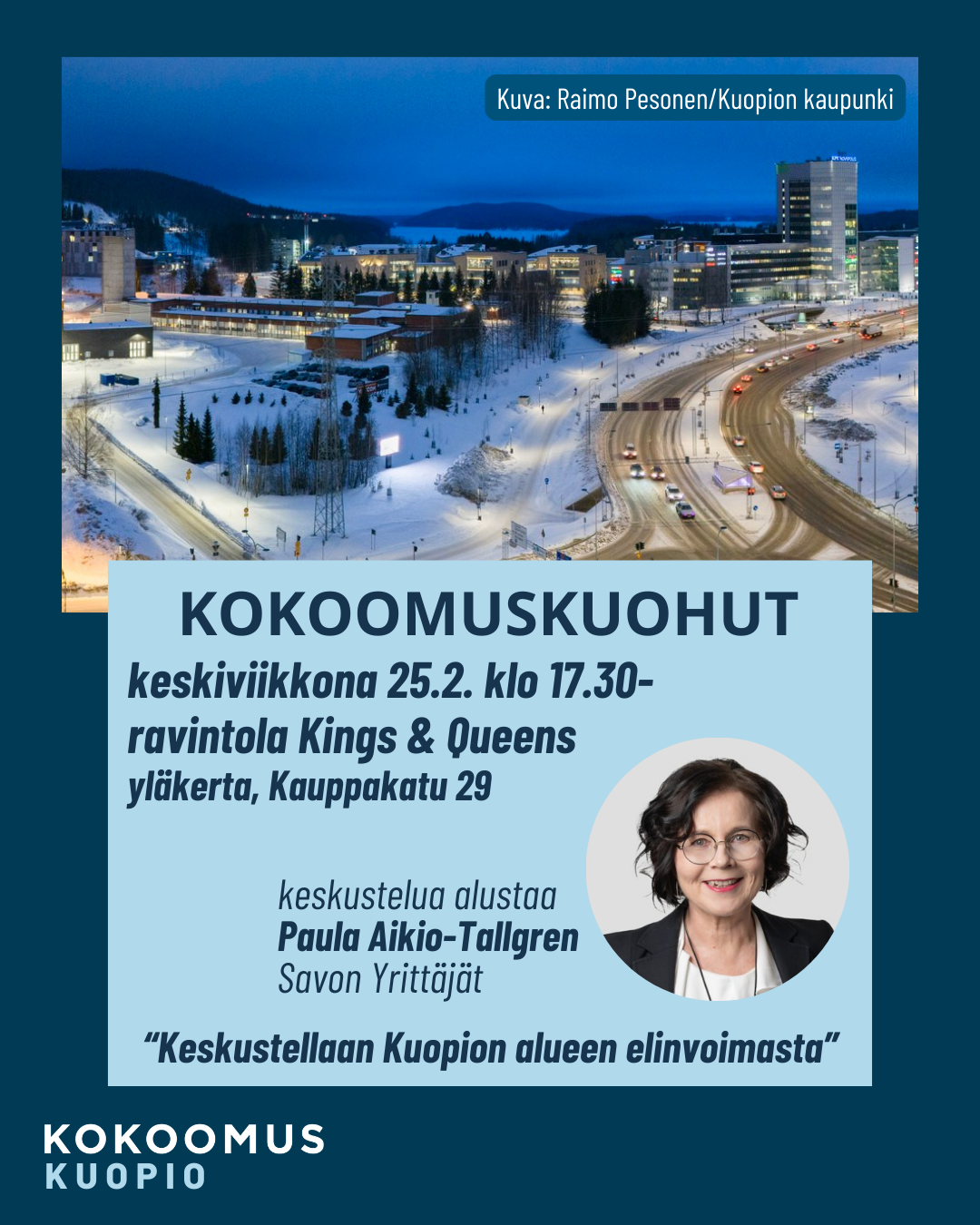 Me Kuopion kokoomuslaiset haluamme rakentaa kaupunkia, jossa arjen sujuvuus, mahdollisuudet ja yhteisöllisyys kulkevat käsi kädessä. Uskomme, että Kuopio menestyy, kun sen asukkaat voivat hyvin, yrittäminen kannattaa ja päätöksenteko on vastuullista ja avointa.